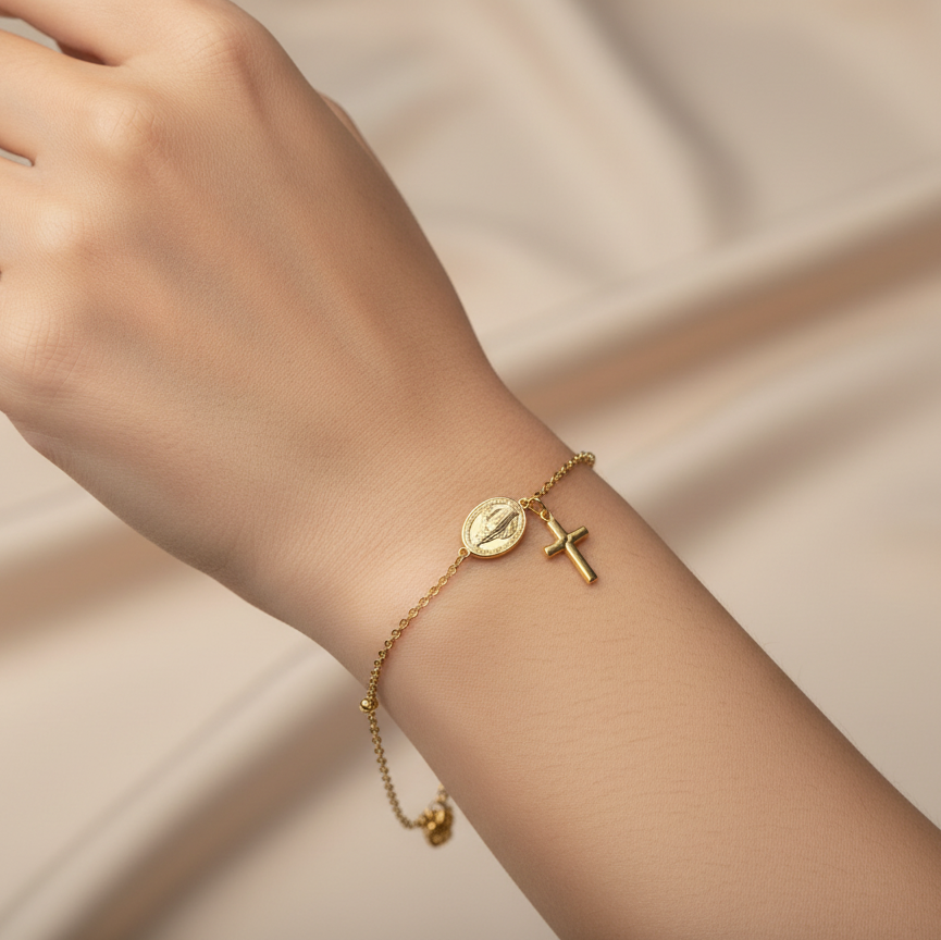 Pulsera Cruz y Virgen gold.