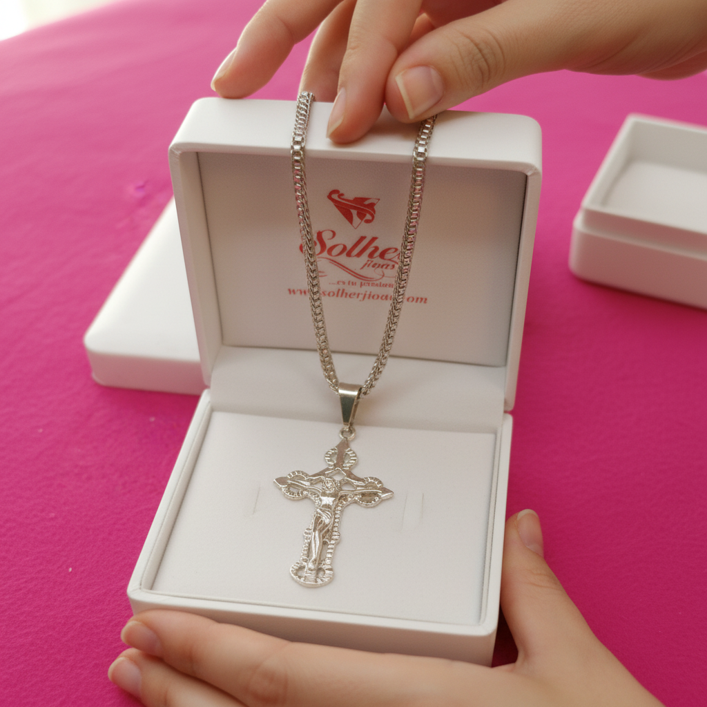 Cadena con colgante Cristo crucificado con relieve en bañado en 4 micras de plata de 1 ley de 925.